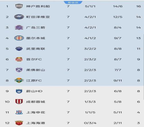 7輪過后的積分榜,由于本輪均未取勝,3支中超球隊仍舊牢牢占據著倒數3個位置。成都蓉城積6分排在倒數第3,申花僅有4分排倒數第2,上港則繼續排名墊底。其中,兩支上海球隊與第8名的分差已經超過3分,在聯賽階段僅剩1輪的情況下已無法躋身晉級區,提前1輪被淘汰出局。