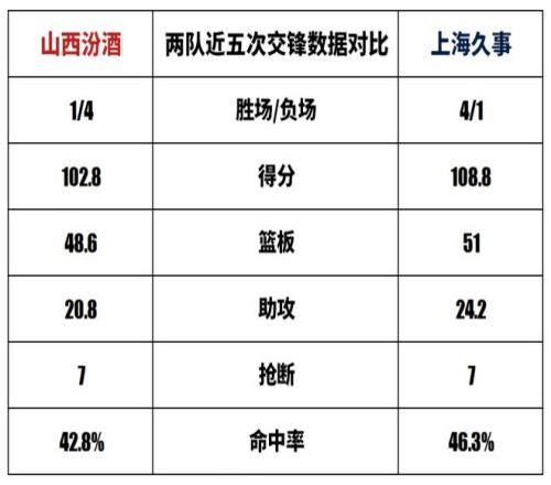 山西汾酒與上海久事在CBA俱樂(lè)部杯歷史上共交手1次,山西汾酒0勝1負(fù);兩隊(duì)在CBA聯(lián)賽歷史上共交手45次,山西汾酒21勝24負(fù),本賽季兩隊(duì)交手1次,山西汾酒0勝1負(fù)。