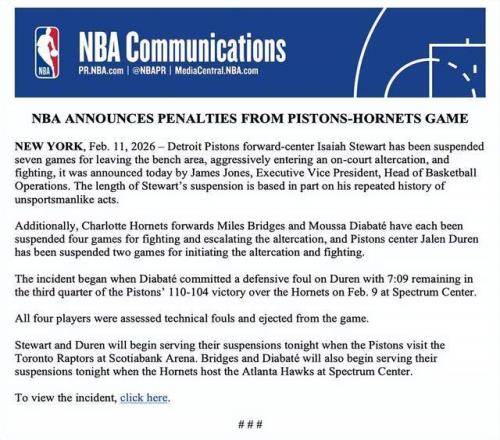 此前,NBA官方還公布了另一張重磅罰單,對黃蜂vs活塞四人驅逐的大沖突進行處罰——