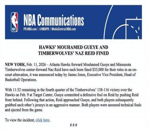 北京時間2月12日,NBA今日官方宣布,對森林狼內線納茲-里德與老鷹前鋒穆罕默德-蓋耶各處以35,000美元罰款,原因是兩人在周二老鷹主場的比賽中發生場上沖突。