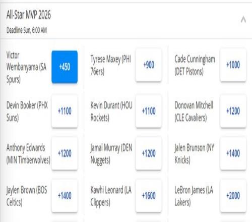 以下是具體賠率排名:1.文班亞馬(+450)、2.馬克西(+900)、3.坎寧安(+1000)、4.布克和杜蘭特(+1100)、6.米切爾、愛德華茲、穆雷(+1200)、9.布倫森和布朗(+1400)、11.萊昂納德(+1600)、12.詹姆斯(+2000)