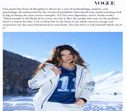 例如谷愛凌的比賽服融合了青花瓷紋樣與青龍刺繡的設計,在互聯網上的討論熱度頗高。不僅國內網友爭相曬圖求同款,就連海外社區也對這件衣服頗為認可,時尚雜志《Vogue》更在最新一期采訪中刊登了她身著安踏戰袍的照片。全程參與設計的谷愛凌顯然也對這件裝備十分滿意,賽后接受外媒采訪時毫不掩飾自己的喜愛與驕傲。