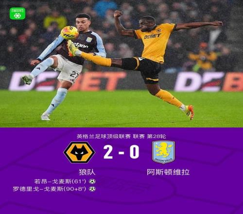 北京時間2月28日英格蘭足球頂級聯(lián)賽 聯(lián)賽 第28輪,狼隊主場對陣阿斯頓維拉。上半場,兩隊均無建樹。下半場,若昂-戈麥斯打破僵局。讀秒階段,羅德里戈-戈麥斯破門鎖定勝局。全場比賽結束,維拉0-2不敵狼隊,遭遇各項賽事三場不勝。