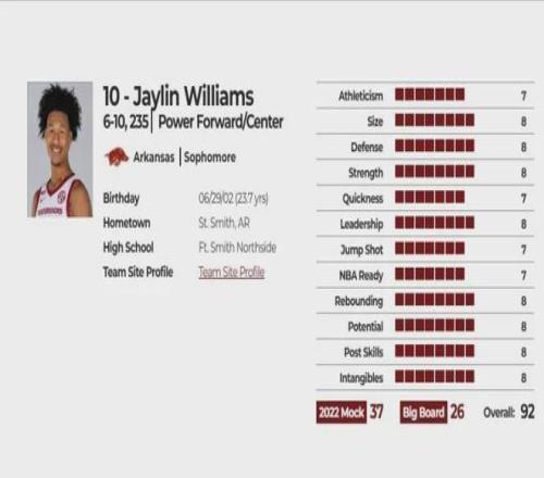 優點:一位不知疲倦的全能中鋒,憑借防守意識和破壞力完美契合現代籃球風格,頂級進攻發起者,擁有出色的球場視野和精準的傳球,大二賽季場均貢獻2.6次助攻,能夠運球突破,攻防兩端靈活機動,有潛力將射程拓展到三分線外,卡位出色,具備成為一名優秀籃板手潛質,在阿肯色大學場均接近10籃板,防守意識極佳,是同屆輪轉換防和造進攻犯規能力最強的球員,本賽季共造成對手54次進攻犯規和48次搶斷,防守全面性是他的最大優勢,幾乎可以防守任何位置球員,讓球隊防守戰術可以靈活制定,在防守端起到帶頭作用,并擁有足夠的體能進行長久作戰。場均出戰近32分鐘,并且在控制犯規方面取得顯著進步,只要在場上,就會全力以赴,并且能提升身邊隊友.