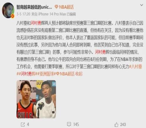 日本男籃那邊的河村勇輝,大概率同樣因為要參加夏聯(lián)放棄世預賽征程,八村塁一般不會參加亞洲賽事且今夏得進入NBA自由市場難以兼顧國家隊任務。