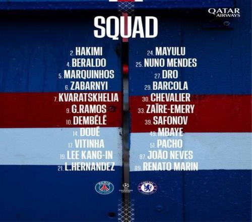 巴黎對陣切爾西大名單: