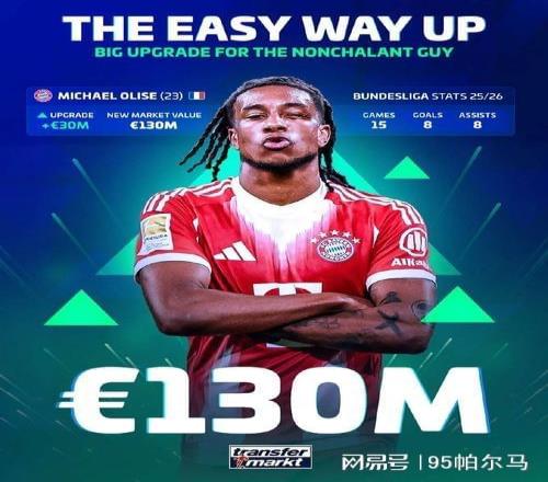 拜仁只用5500萬歐元就招募了奧利塞,在數據論的發酵下,這是一筆物超所值的交易,事實上法國國腳的最新身價達到了1.3億歐元,且在2025年的身價漲幅達6500萬歐元,充分驗證了野蠻生長的趨勢。