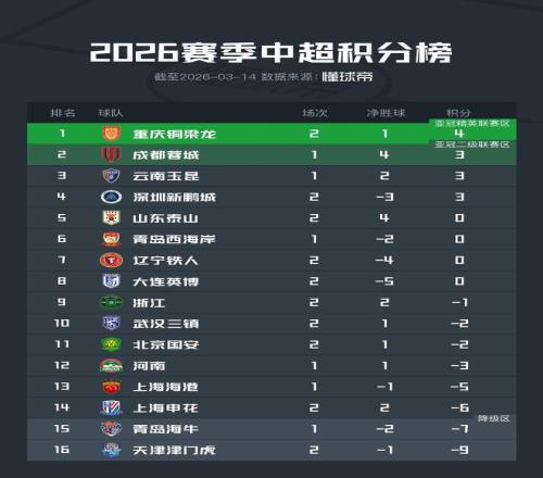 實時積分榜上,銅梁龍兩輪1勝1平,積4分,暫列積分榜首位。少賽一輪的成都、云南位列二三,西南地區三支球隊排名中超前三。